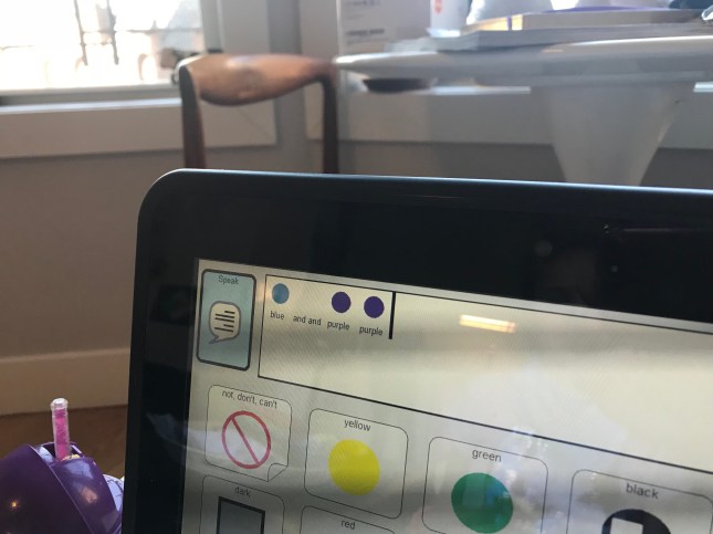 She independently navigated this page the other day when talking to Elaine, her speech therapist. (FYI this is a complex sentence to structure using Tobii/PODD so it’s pretty mind blowing.)